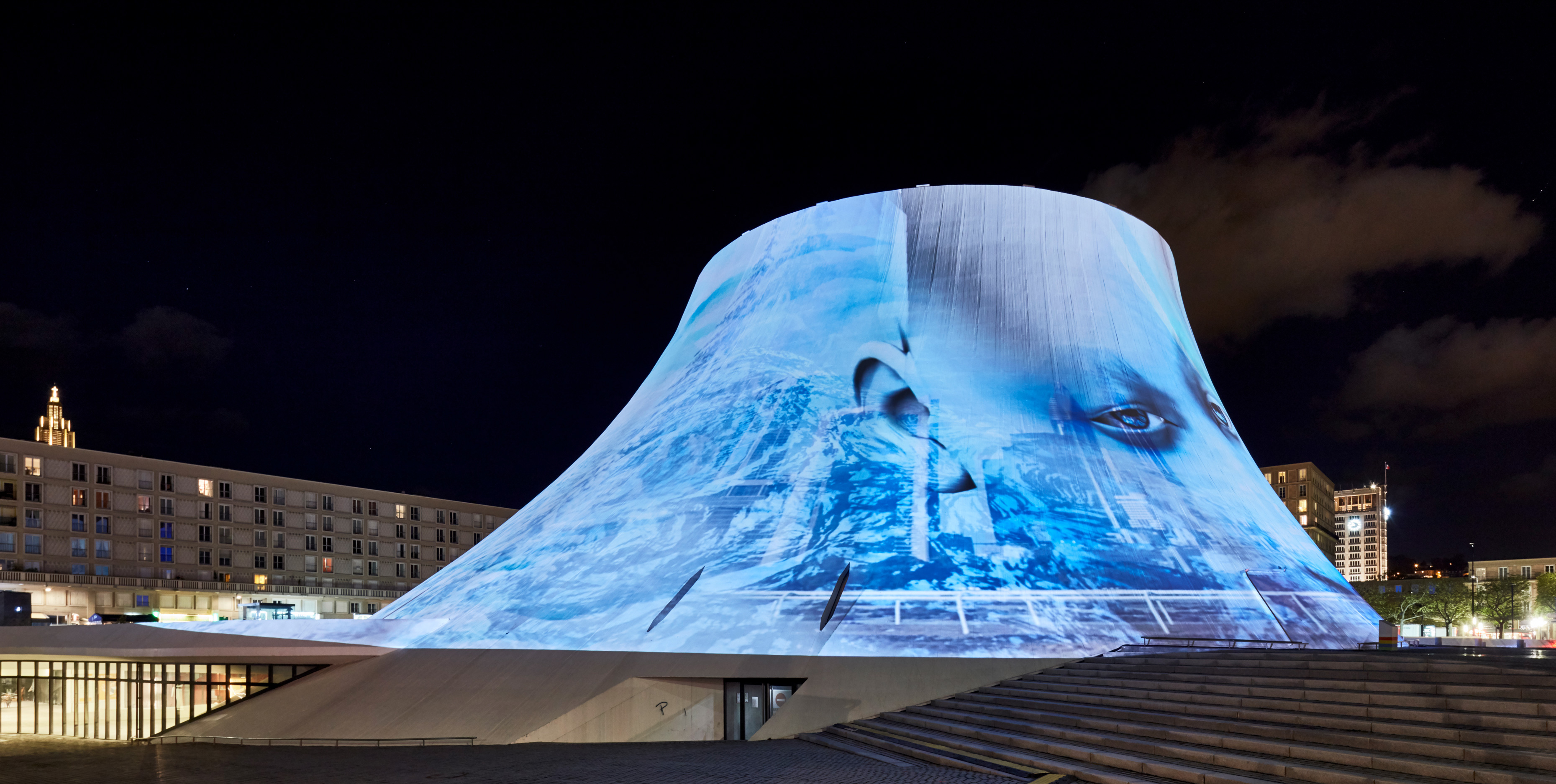 ORT was originally commissioned to seamlessly video-wrap around Oscar Niemeyer’s enigmatic Le Volcan, a theater building in Le Havre, France.